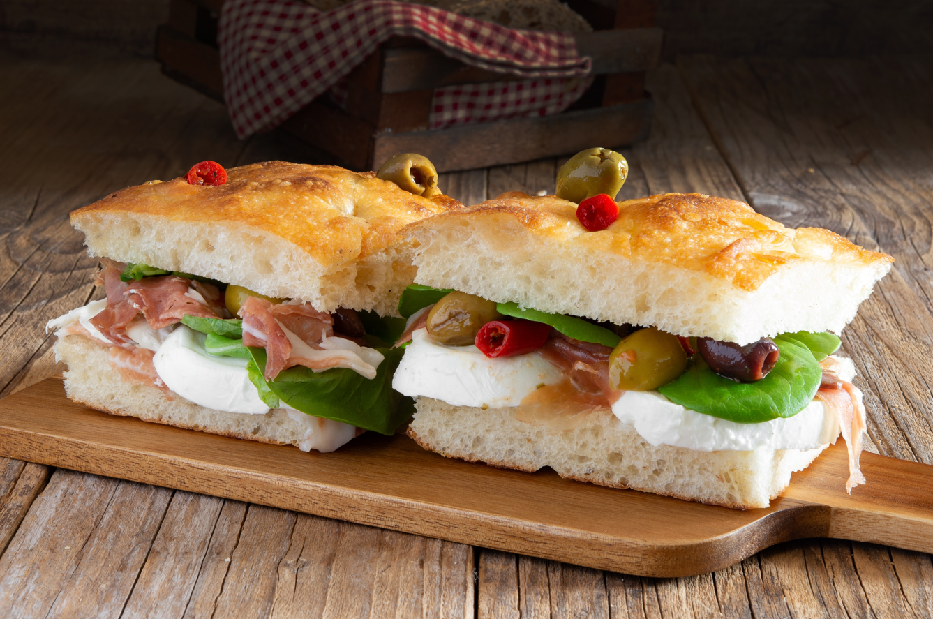 Focaccia con prosciutto crudo e rucola