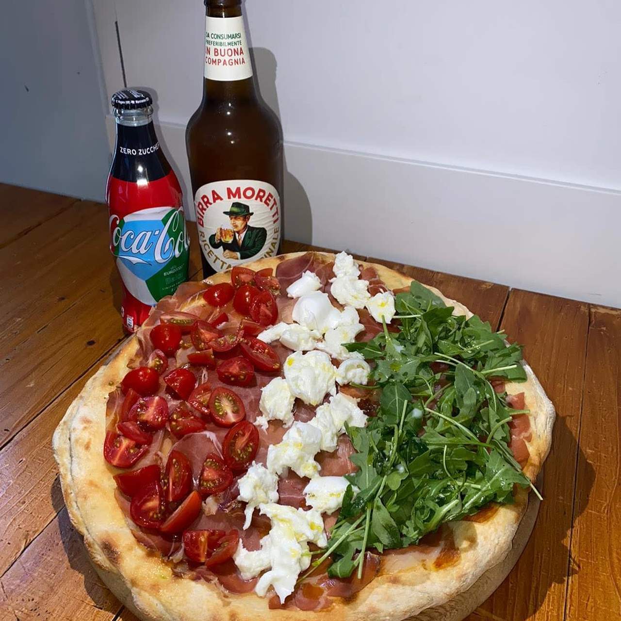 Fior di latte, speck, burrata pugliese, datterino giallo, crema pistacchio