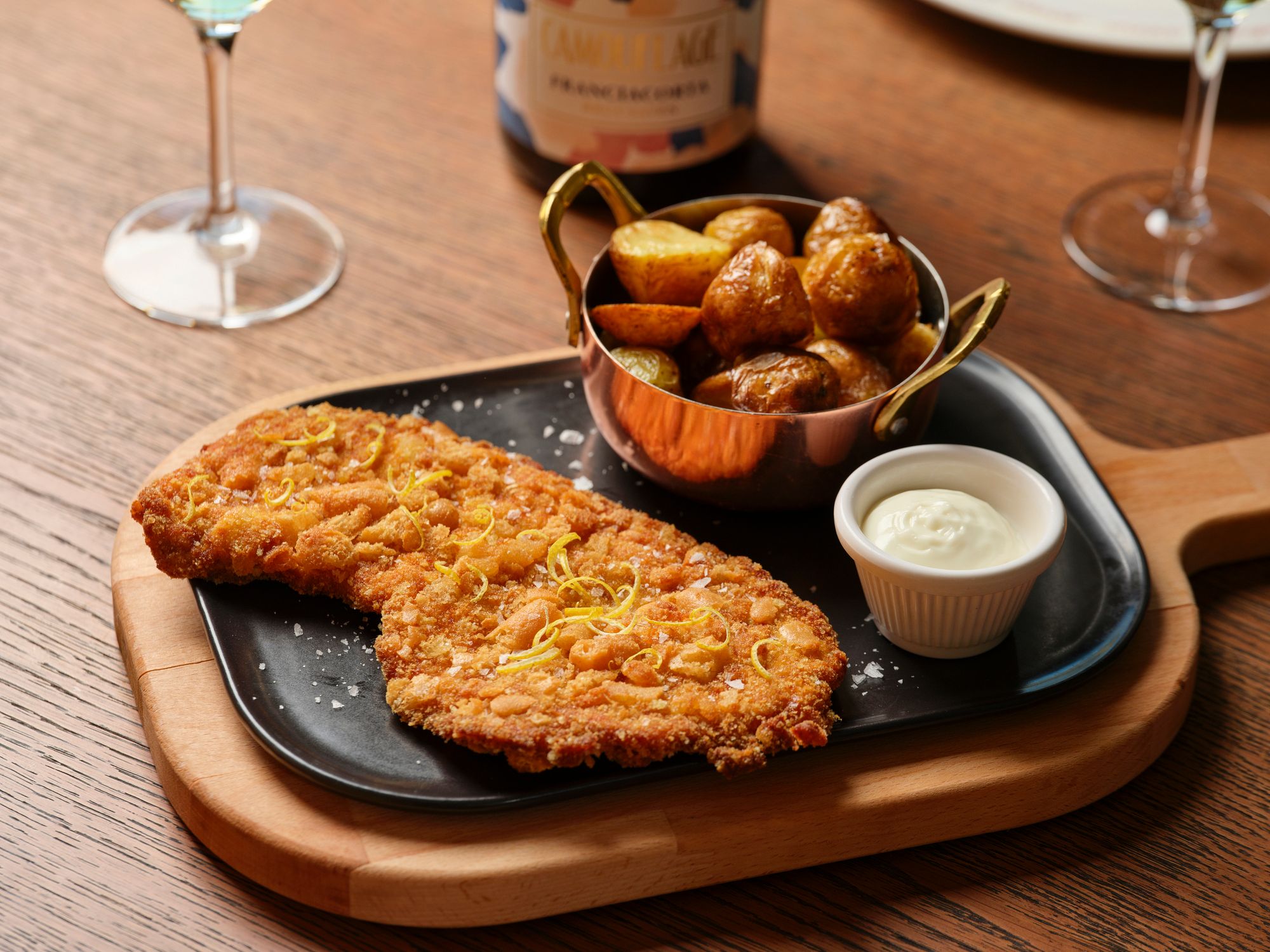 Tagliata di petto di pollo con verdure di stagione al forno, servita con maionese al Traminer