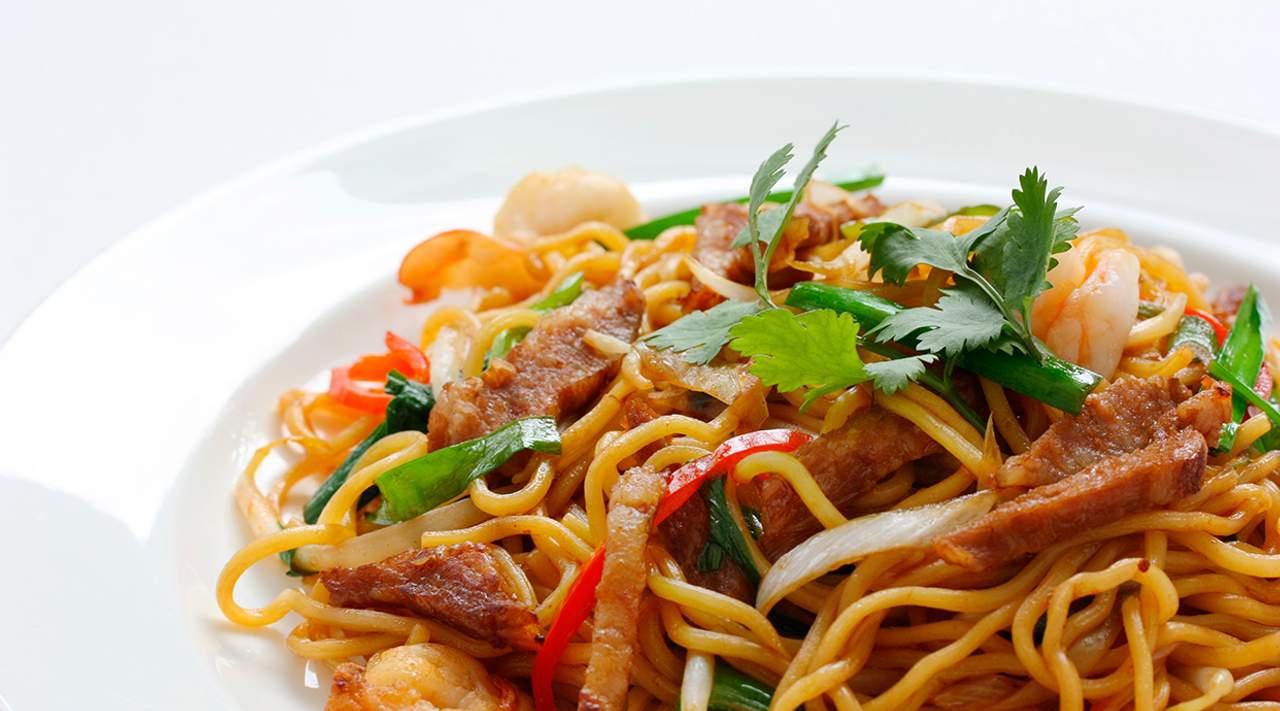 Spaghetti saltati con verdura e carne