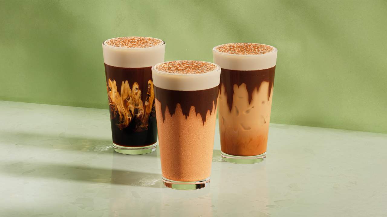 Espresso e latte freddo, con salsa al cioccolato dal gusto nocciolato, decorato con panna montata al gusto mocha in stile mousse e una spolverata di mocha.