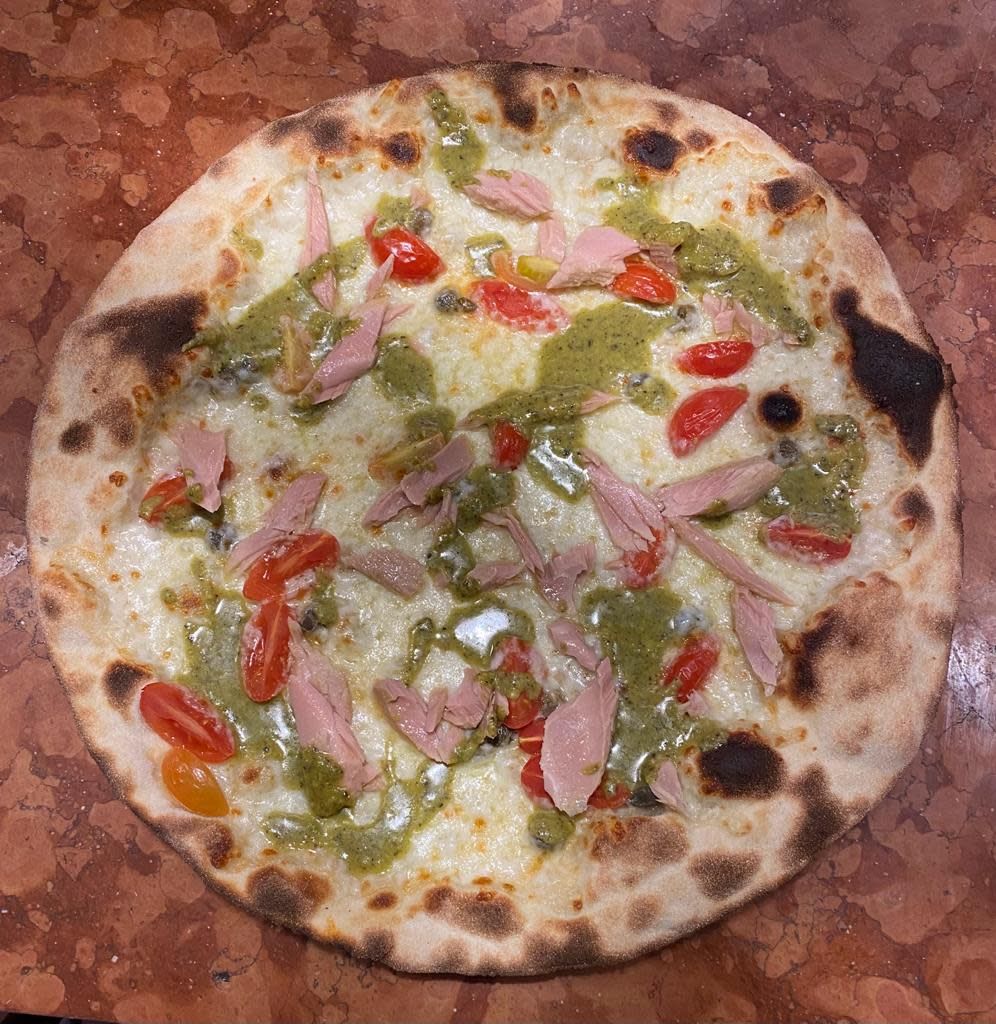 Fior di latte, pomodoro Mutti, salamella, peperoni, cipolla di Tropea mozzarella
