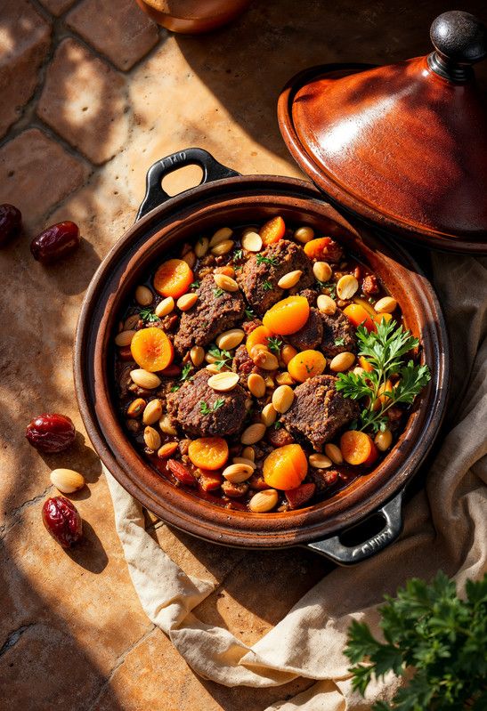 Carne di manzo, prugne, albicocche, cipolla, mandorle, spezie marocchine