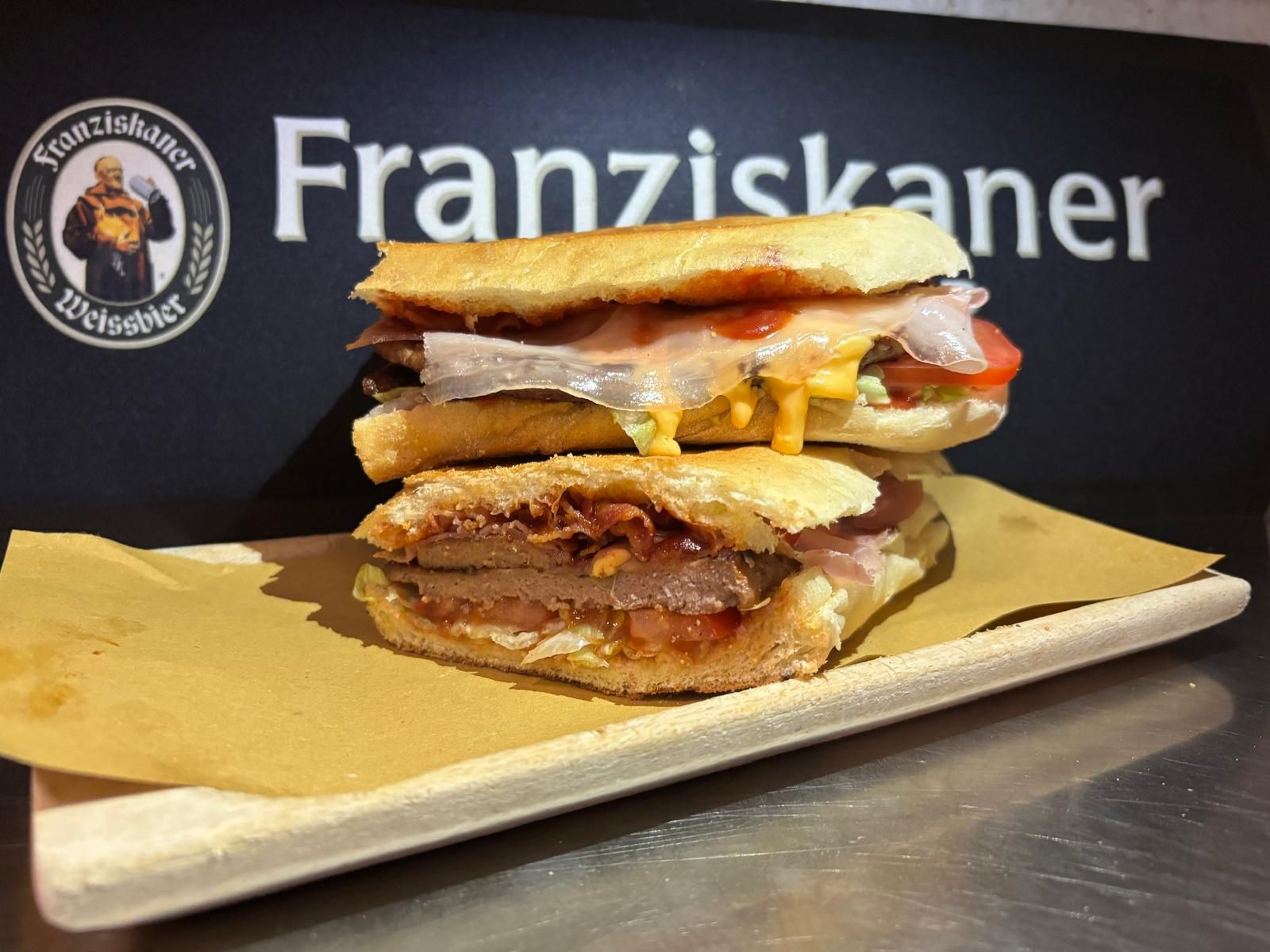 Pane pizza 2 hamburger 180 g, maionese, ketchup, insalata, cipolla, bacon, pomodoro emmenthal, tabasco