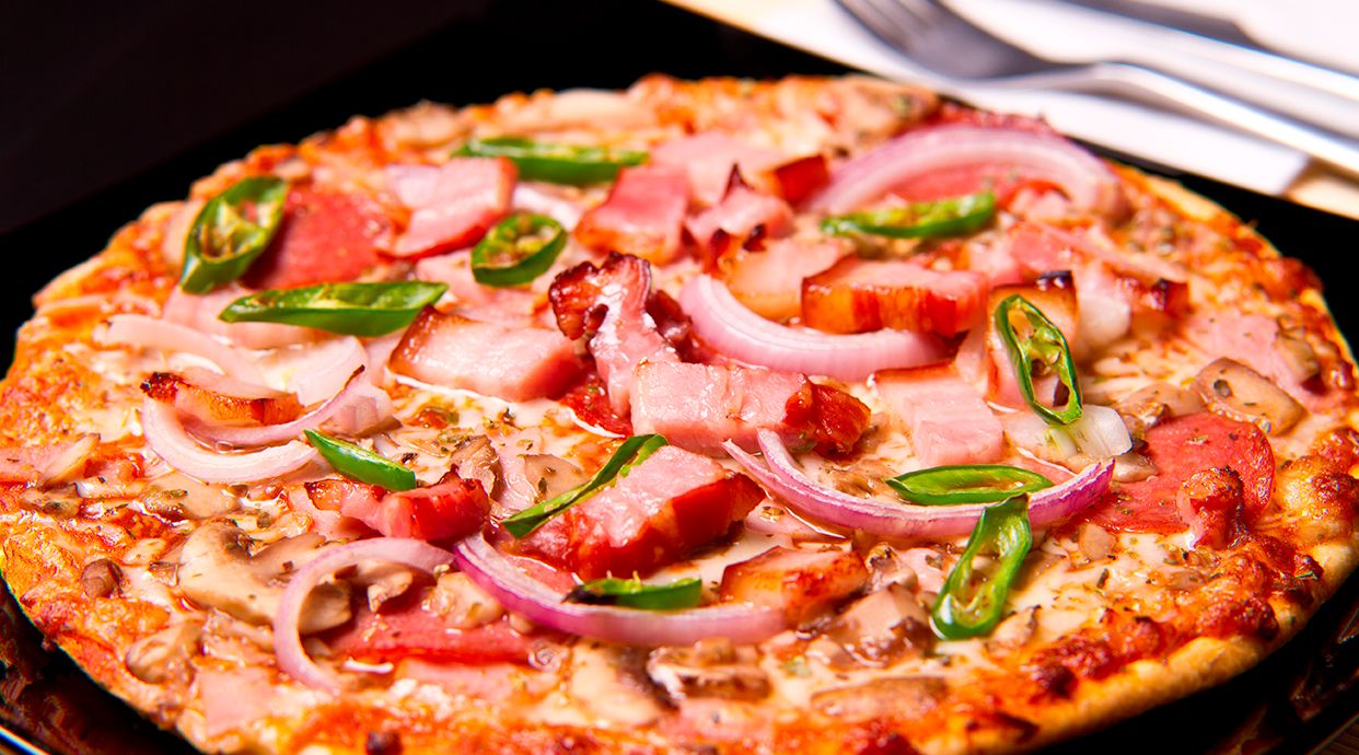 Pomodoro, mozzarella, prosciutto cotto, funghi, salamino, salsiccia, carciofi, cipolla e wurstel