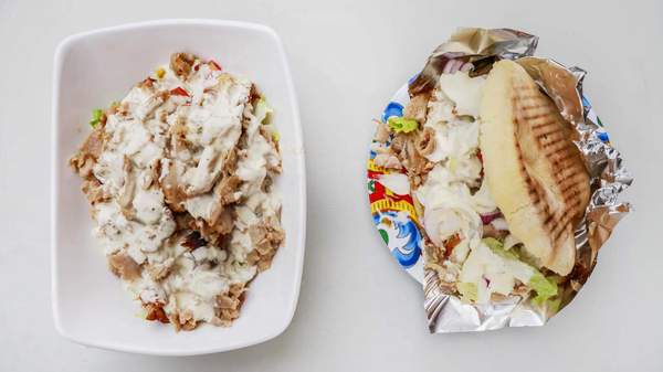 200 gr kebab, lattuga, pomodoro, mais, mozzarella, cipolla, salsa yogurt servito con pane tostato con olio e origano