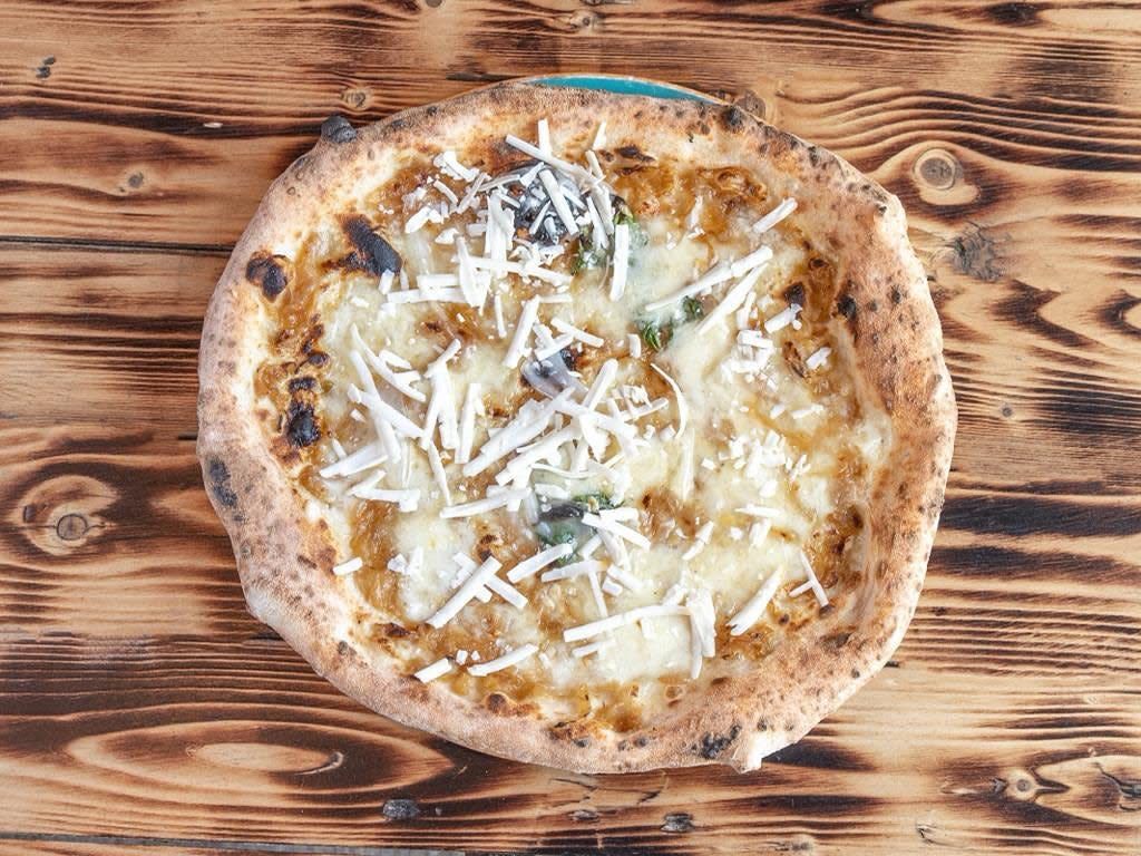 Cipolla ramata di Montoro stracotta, lardo, fior di latte dei monti Lattari, basilico e all'uscita scaglie di cacioricotta di capra cilentana Presidio Slow Food