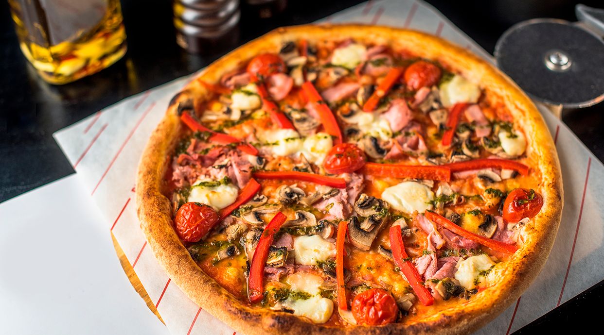 Pomodoro, mozzarella, prosciutto cotto, funghi carciofi, olive verde