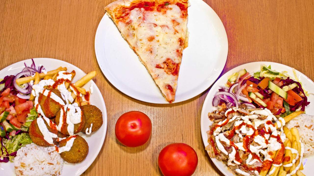 Piatto döner kebap con patatine, riso, verdura fresca, salse yogurt e piccante e pane
