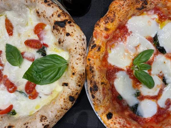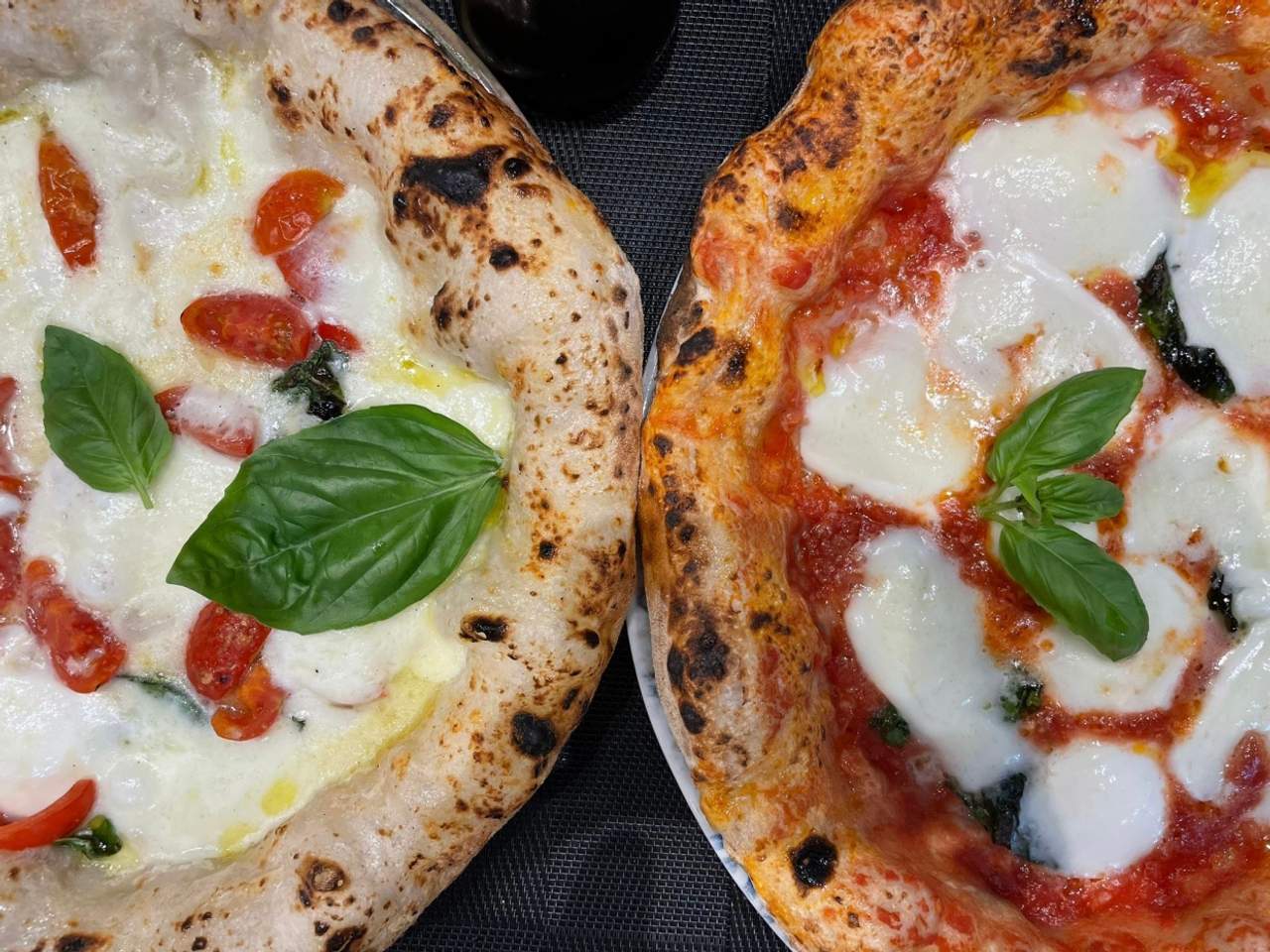 Salsa di pomodoro San Marzano DOP, capperi, olive nere, acciughe, origano, Fiordilatte di Agerola DOP, basilico e olio EVO