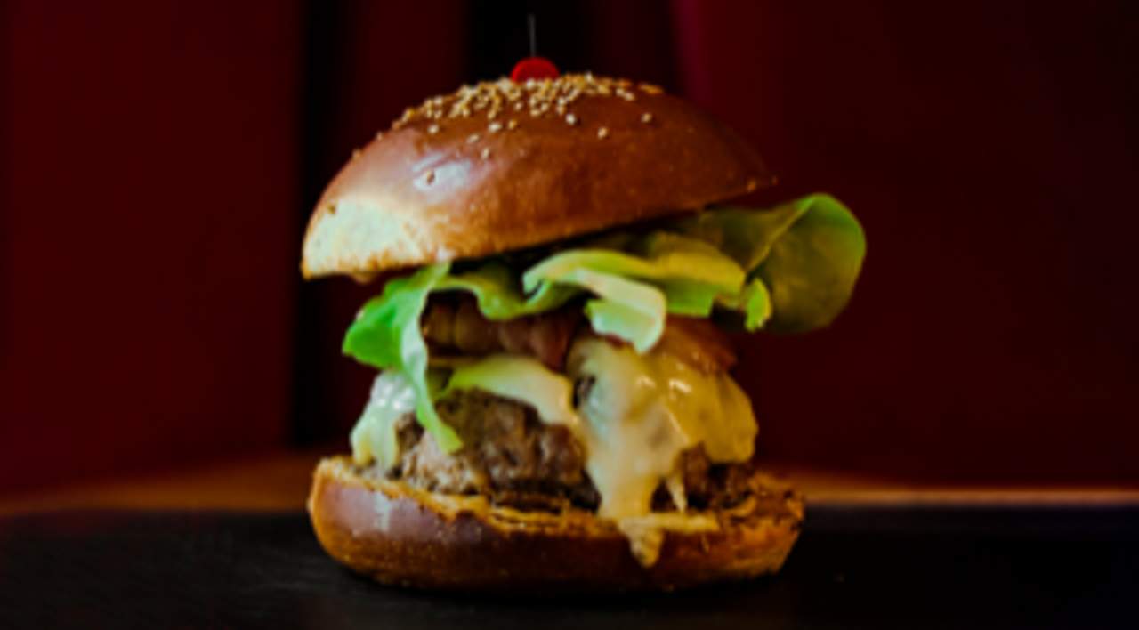 pane al burro con semi*, doppio hamburger 150 gr. con cuore di salsiccia di Bra, Bra duro DOP, bacon, pomodoro, lattuga, cipolla di Tropea caramellata, senape e salsa Mondofood** con contorno di patatine fritte