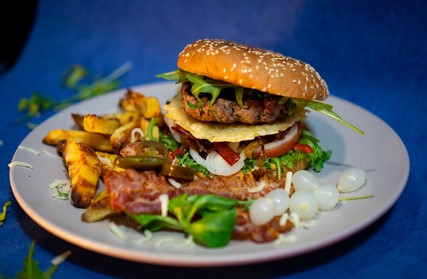 Pesto di basilico, bacon croccante, scamorza, cipolla caramellata, hamburger 250 g , scottona