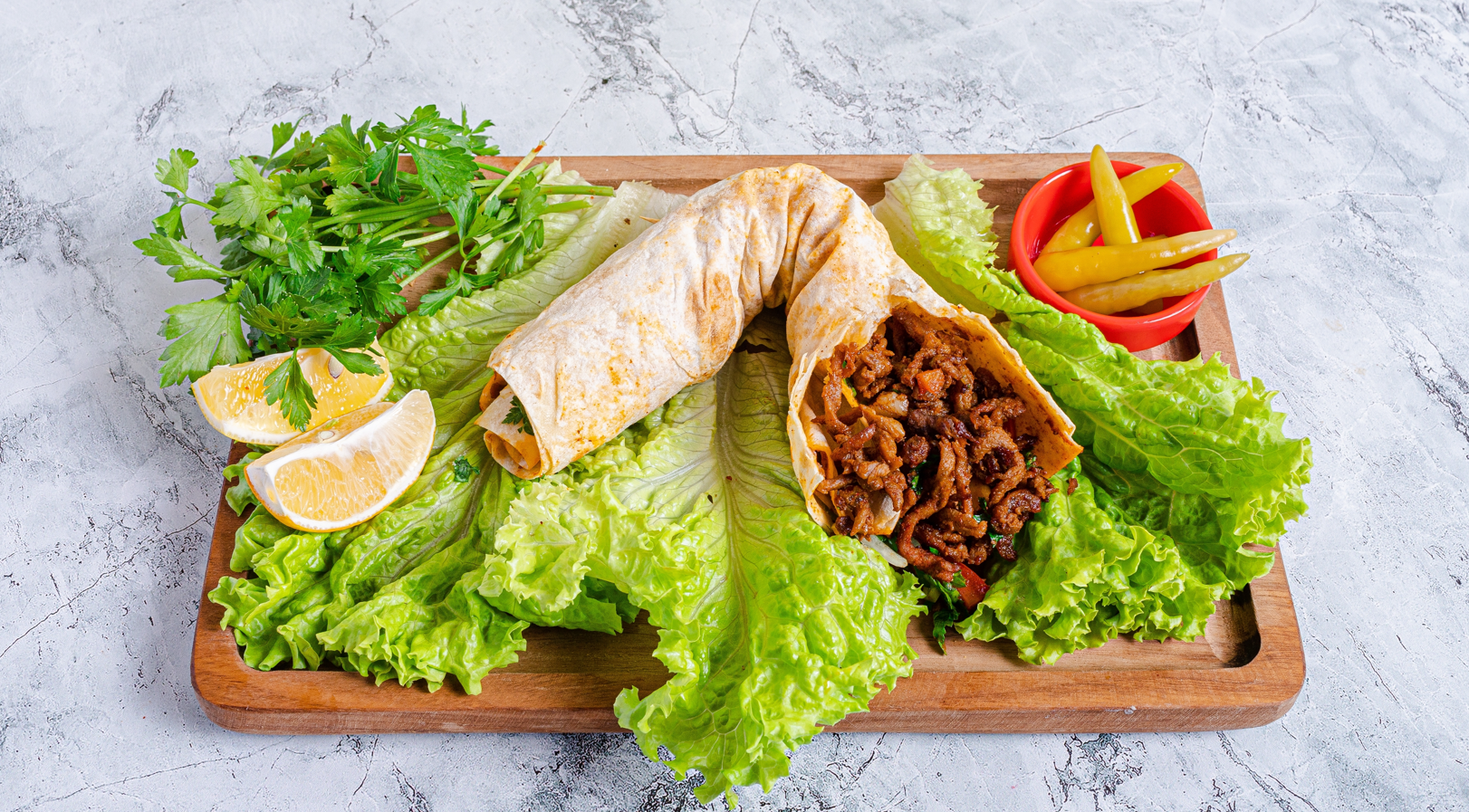 Carne kebab, insalata, pomodori, cipolle, salsa yogurt e salsa piccante