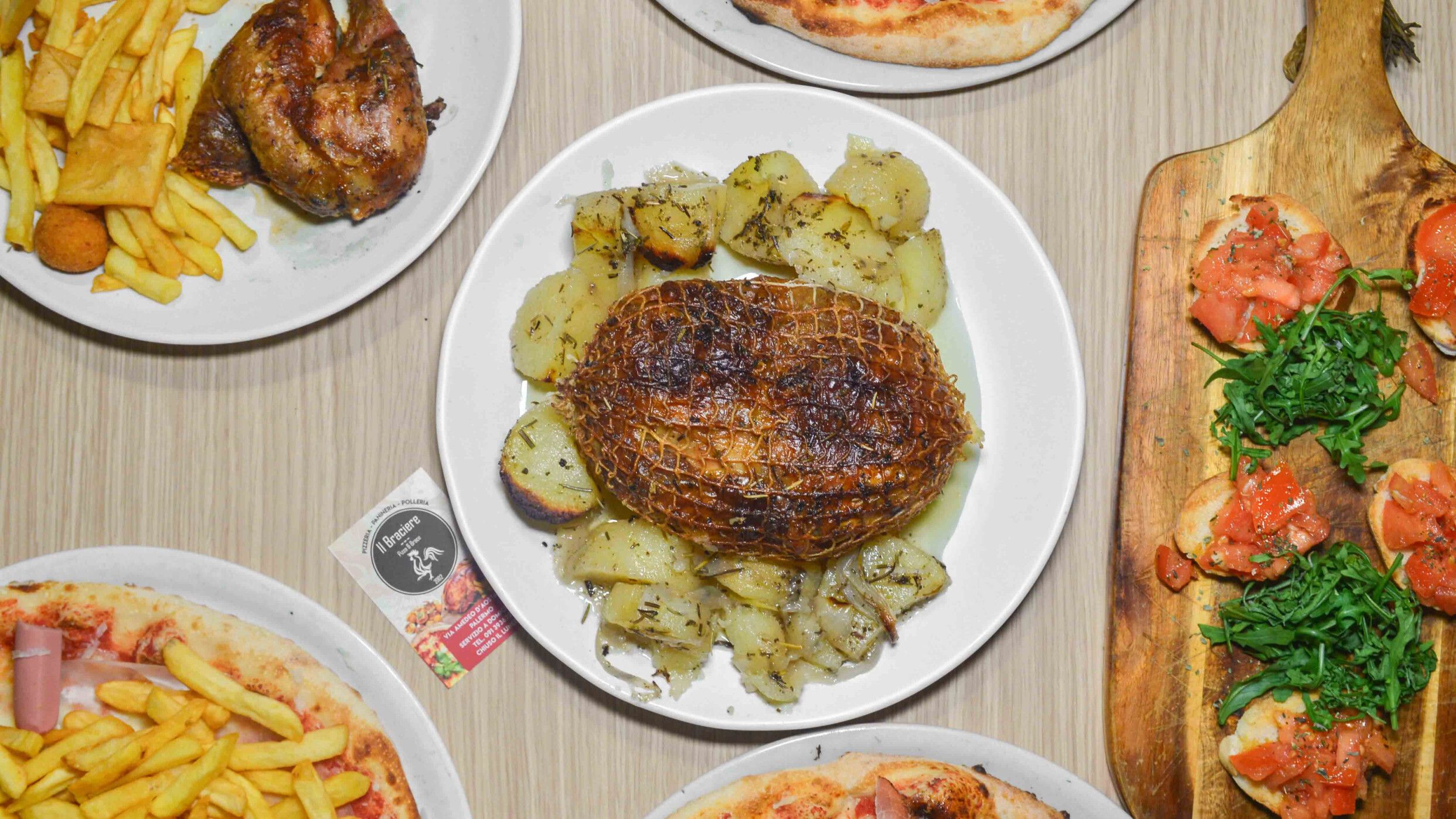 1,3Kg di gustoso pollo alla brace cotto a legna con mix di patatine fritte, panelline e supplì, vaschetta di patate al forno e 10 mignon