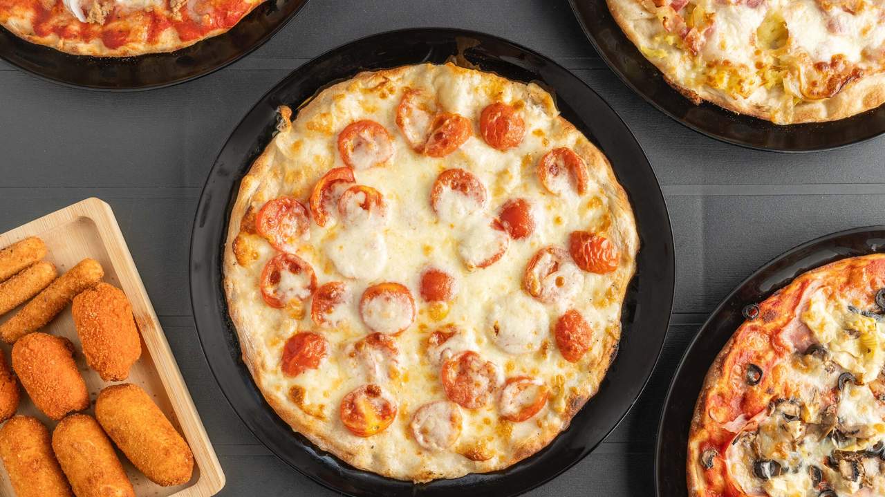 Pomodoro, mozzarella, prosciutto cotto, funghi, carciofi, olive nere