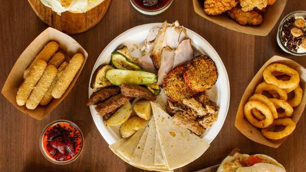 Melanzana panate due volte e fritta, salsa tzatziki, salsa bbq, rucola, pomodori, cipolla dolce e polpette del contadino di verdure in pane bun