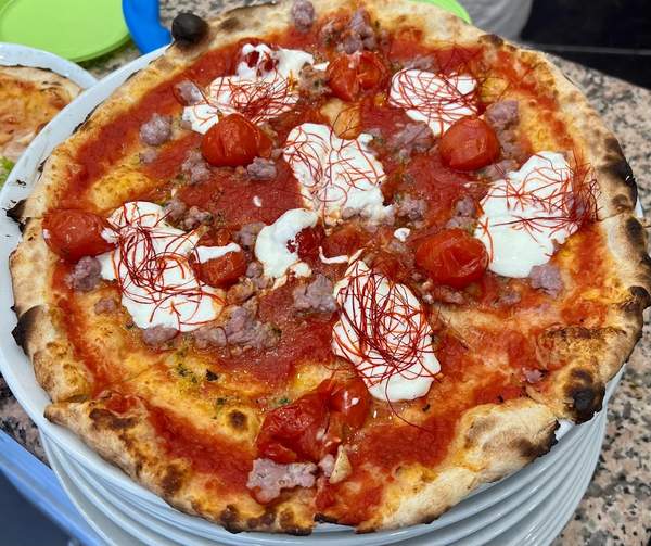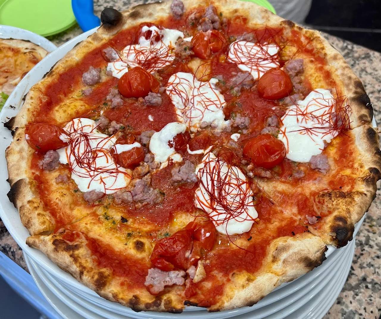 Pomodoro, mozzarella, doppio impasto, salsiccia