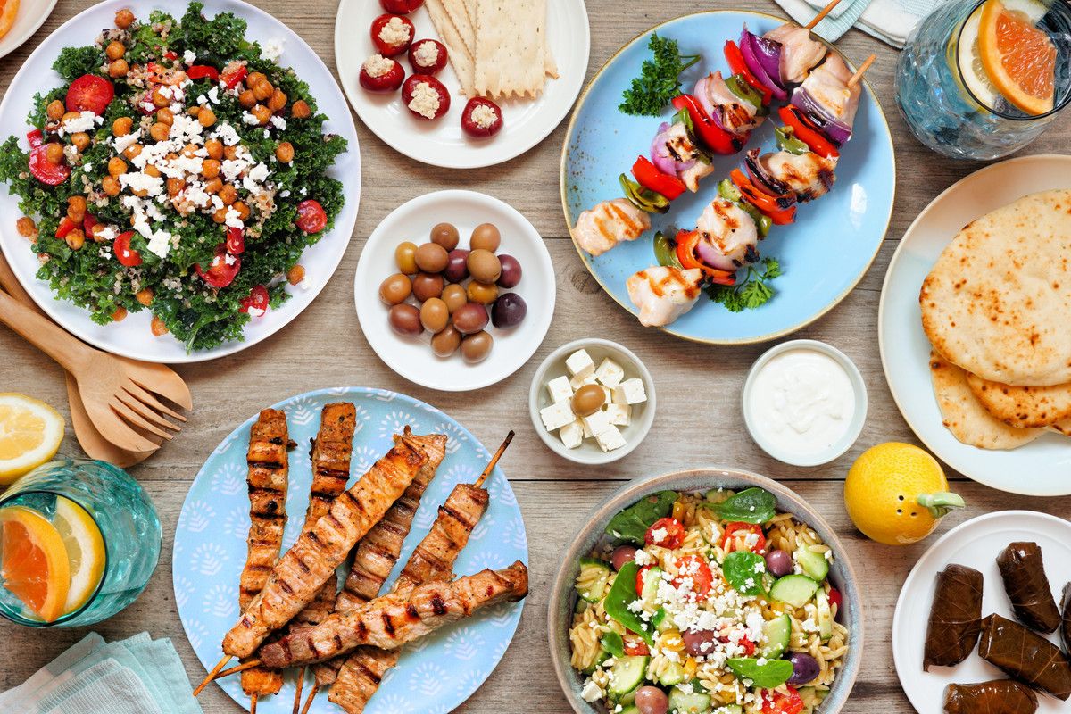 Carne di maiale o pollo servita con pomodori, cipolla, tzatziki, patate e pita
