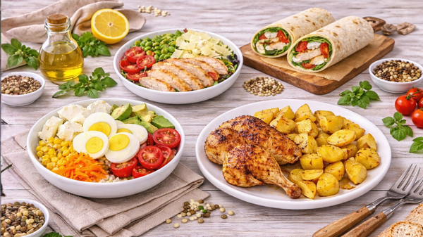 Riso bianco, tagliata di pollo, avocado, carote, uovo sodo, mais, feta e pomodorini