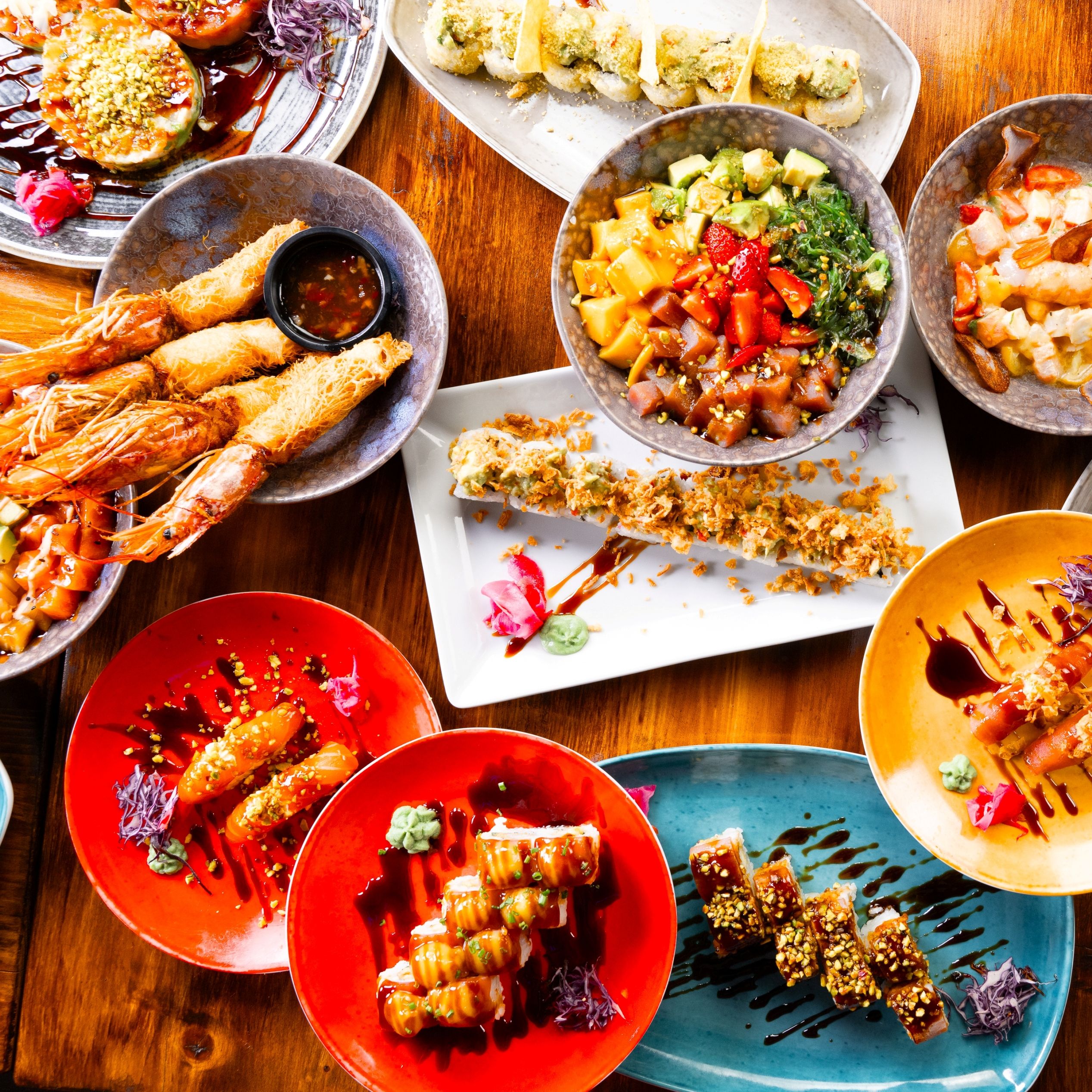 Salmone, tonno, pesce bianco, gamberi argentini, polpo, coriandolo, salsa ceviche, cipolla di Tropea, peperoncini rossi e verdi dolci, pomodoro datterini, mango, fragole