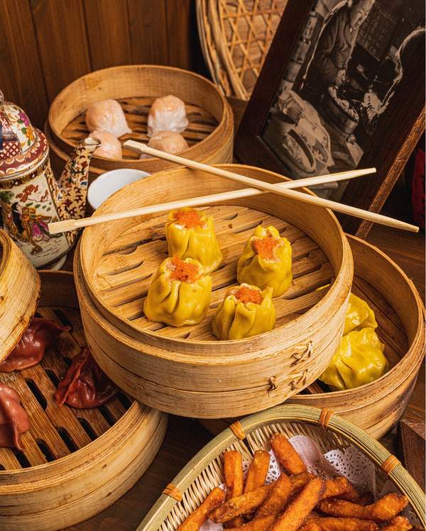 烧卖 - Shrimp, pork, shiitake mushrooms, bamboo, fish roe - Gamberi, pollo, funghi shiitake, bambù ed uova di pesce impasto all'uovo.