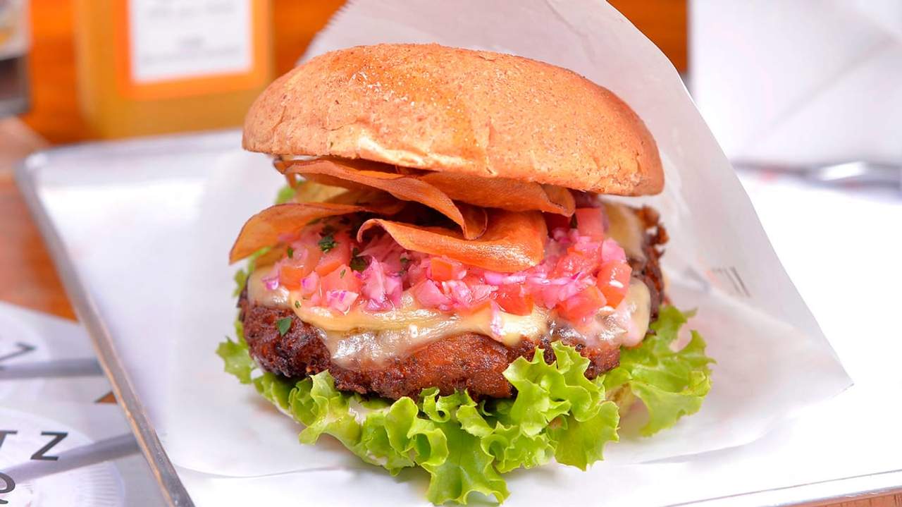 14 Grain bun, 200 g burger vegetariano, pomodori secchi, senape al miele, spinacino e cipolla brasata