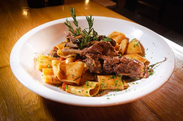 Pappardelle con carbo-crema mantecata con crema alla zucca, guanciale, semi di zucca e chips di zucca