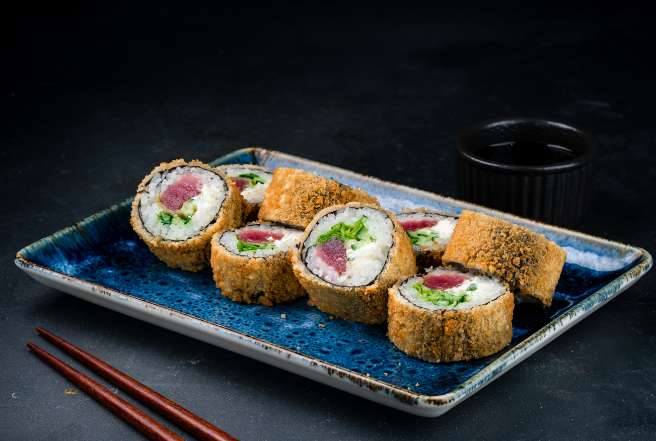 Riso sushi, alga nori, pollo fritto, rucola, maionese, mayo spicy