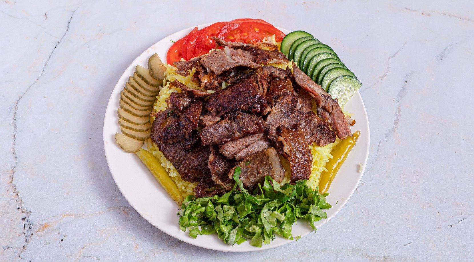 Pomodoro, mozzarella, kebab, insalata, pomodoro fresco, cipolle, salsa yogurt, salsa piccante