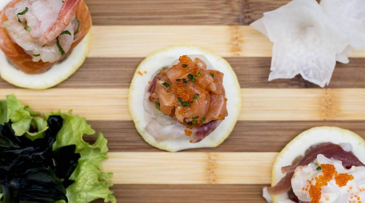 Gamberi, salmone, branzino, avocado, uova di pesce volante, maionese