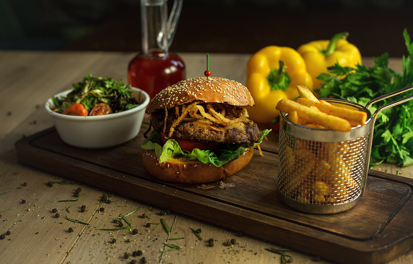 Hamburger 220 g, doppio formaggio, gorgo piccante, cipolla fritta, salse