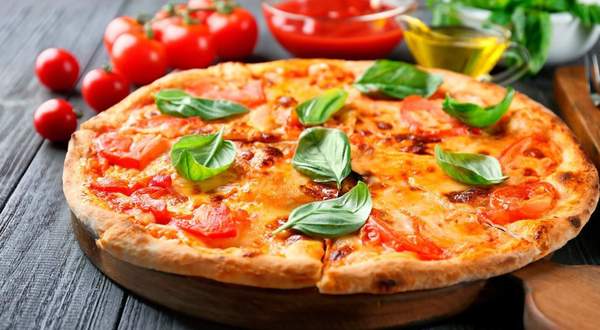 Pomodoro, mozzarella, prosciutto, funghi, carciofini, ricotta, wurstel, salamino piccante, uovo sodo e olive