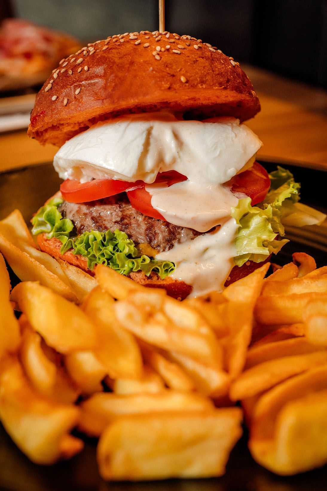 Hamburger di suino nero di Calabria con pane di sesamo, formaggio fuso, edamer, cipolle arrostite, patate steak house, servito con insalata, pomodori, cipolla arrostita, salsa bbq e salsa big house