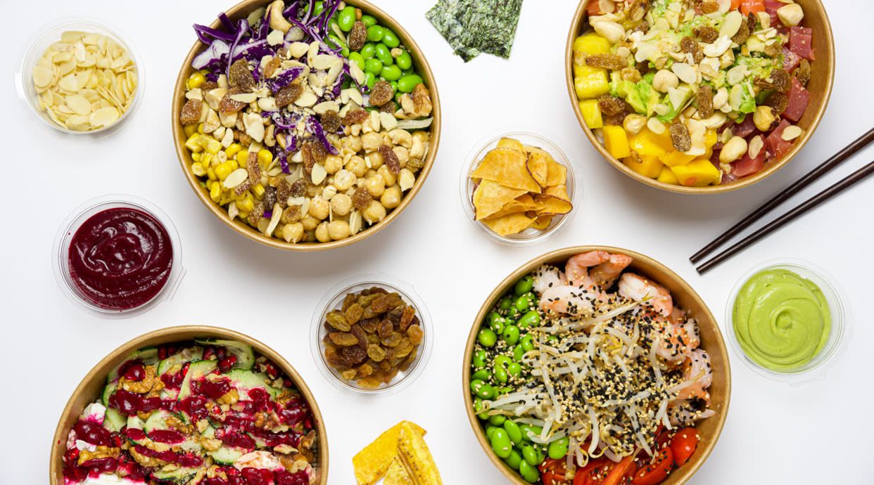 1 o 2 basi, 3 proteine, 4 vegetali, 2 croccanti, 2 condimenti