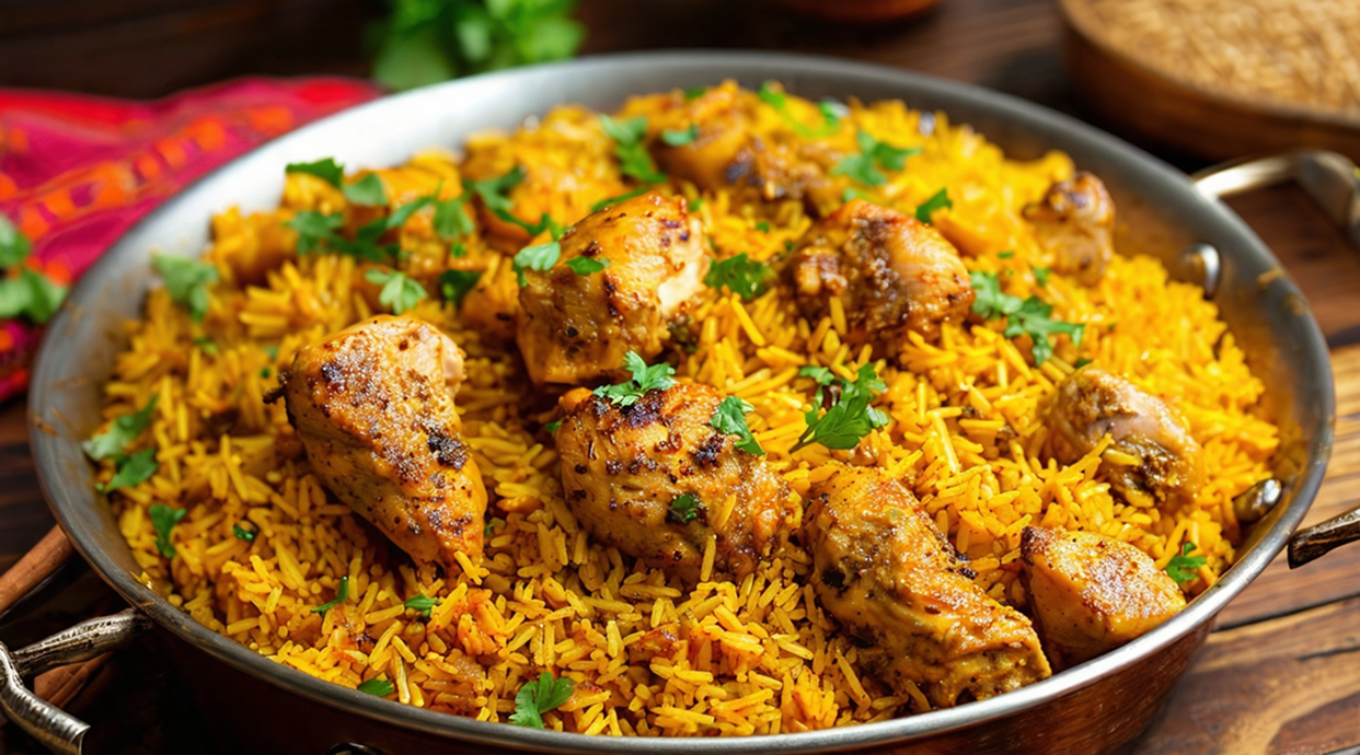 Aromatic spiced chicken with fluffy, savory pilau rice.