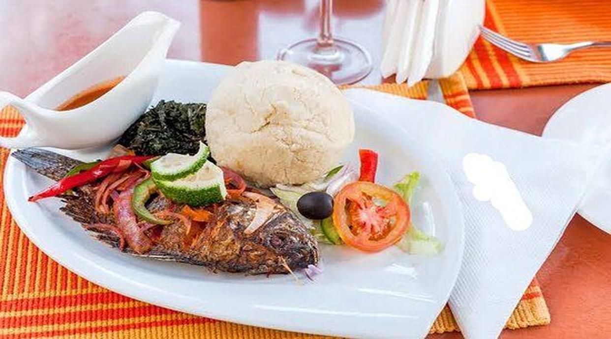 Ugali served with fish, either fried dry or cooked in a flavorful sauce.