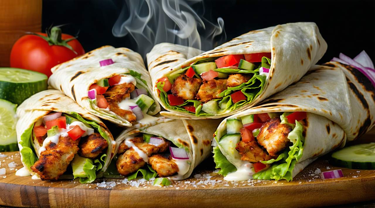 Grilled chicken wrap served with mayonnaise and pickles with chips