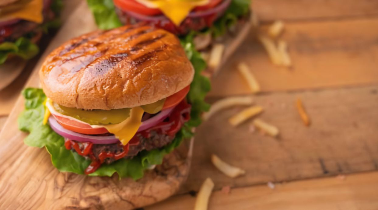 Grilled beef patty in sesame brioche bun with lettuce, onion, tomatoes, cheese, fried egg, bacon, gherkins and French fries.