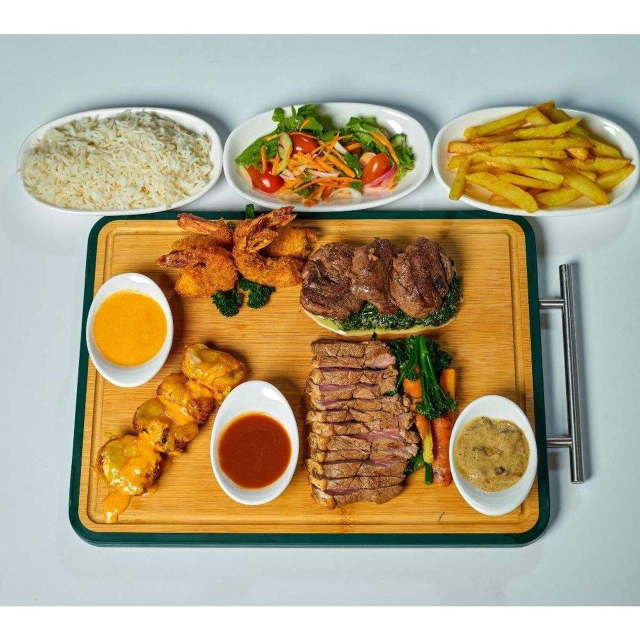 A perfect blend of marinated beef strips sauteed with coloured peppers,oyster sauce served with vegetable rice, pouched egg and spinach puree