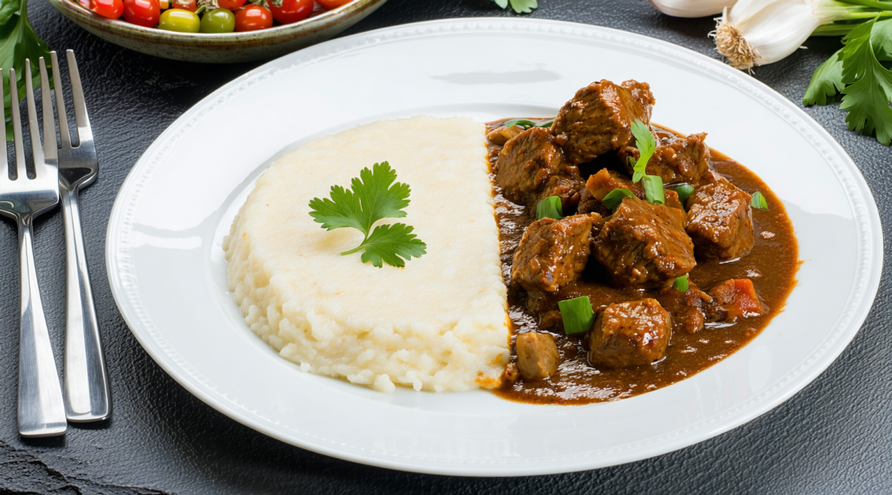 Tender beef served with ugali (maize meal porridge)