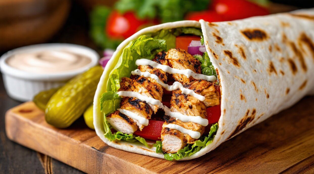 Classic soft pita wrap brimming with tender chicken, veggies, and signature sauces.