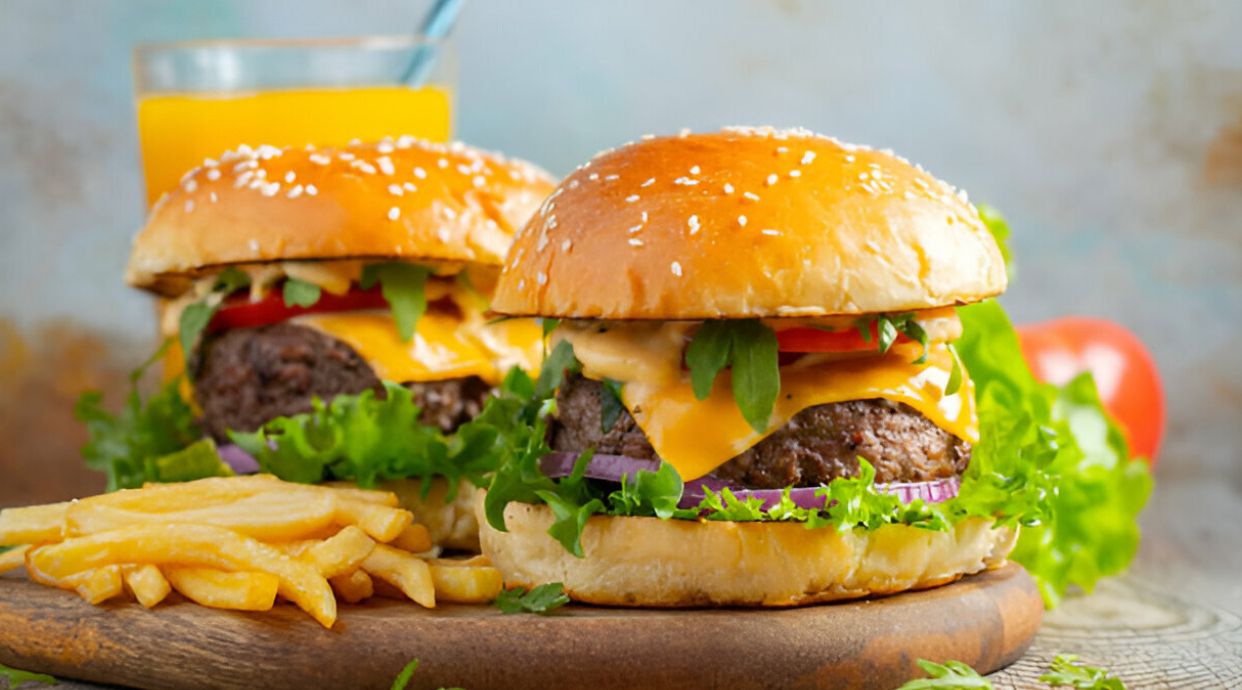 Made with ground meat patty, cheese and lettuce toppings placed between two halves of a bun