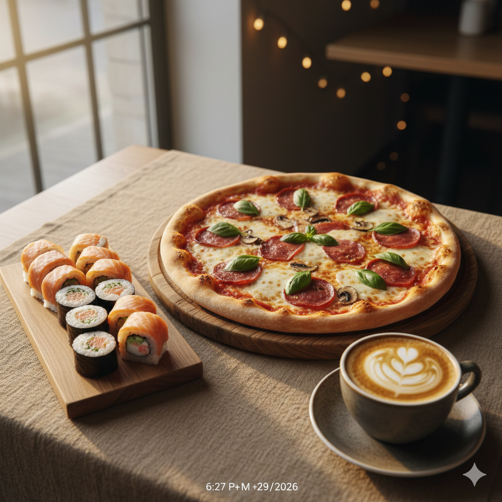 56шт ролл 2 пиццы В подарок Salam cola и картошка Фри Пепперони Маргарита Саке темпура Темпура с курицей Филадельфия Калифорния Анигара маки Ролл с огурцом наггетсы