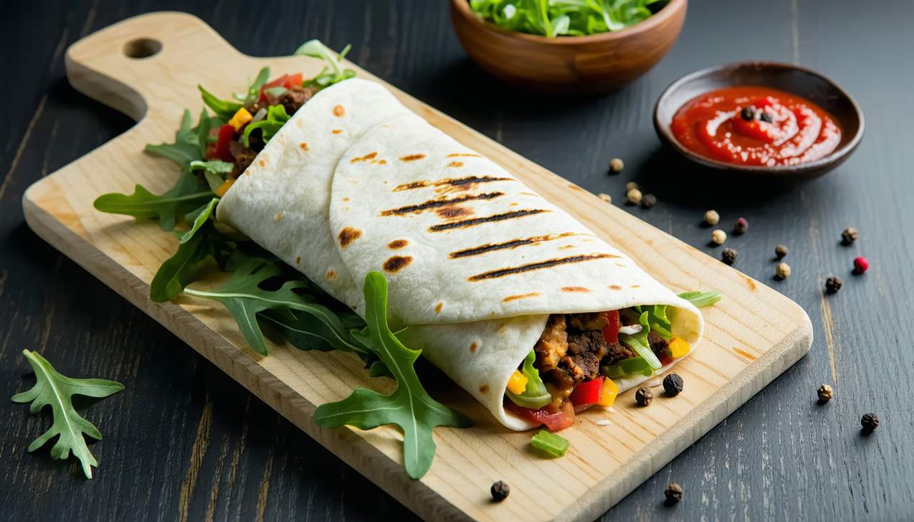 шаурма без мяса , с разнообразием овощей картофелем фри и соусом сацебели.