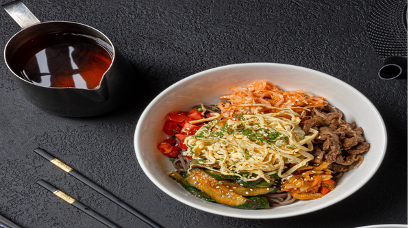 Говядина, рис, огурцы, тиргум-ча, морковь-ча, перец полуострый, вешенки, папоротник, яйцо, перечная паста, кочижан