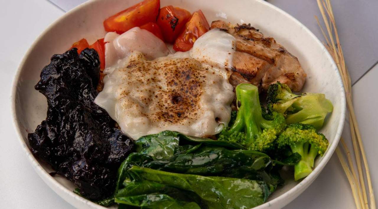 Фирменный завтрак подается в сочетании с куриной голенью, фирменным ризотто из пшена, жаренными брокколи, шпинатом и вяленная свекла