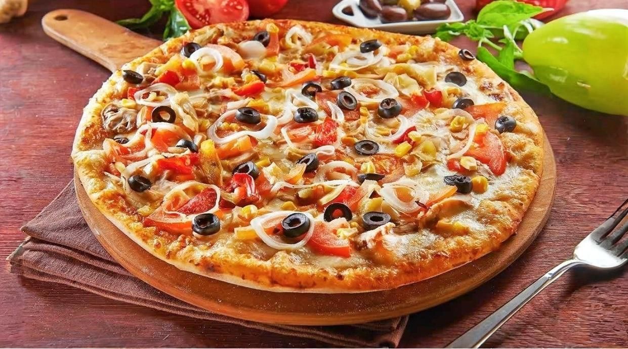 Соус для пиццы, фирменный соус, сыр, картофель, морковь, лук, кукуруза, огурцы, маслины, болгарский перец, халапеньо