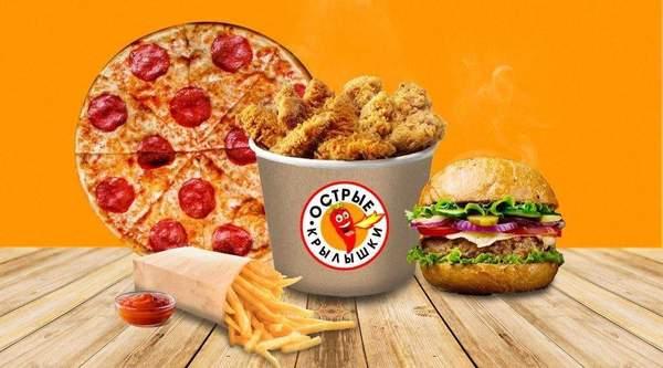 - Острые крылышки (5 шт.) - Картофель фри - Coca-Cola (0,5 л.) или Pepsi (0,5 л.) - Соус на выбор (1 шт.)