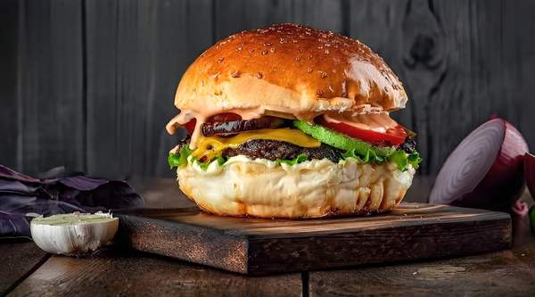 Фирменная булочка, котлета из говядины, помидоры, халапеньо, листья салата, сыр, майонез, соус "Острый"