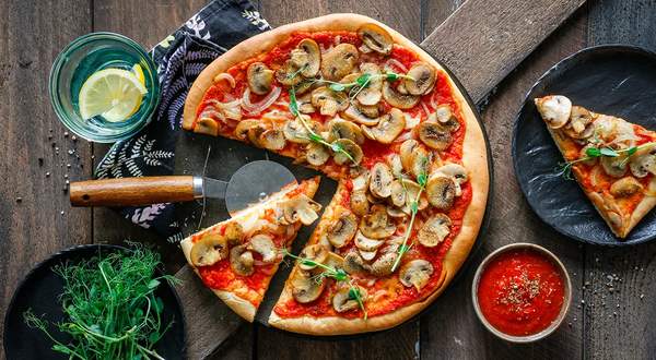 тесто,соус для пиццы,сыр моцарелло,перец болгарский,лук красный,маслины,мясо говядины,пепперони тойбосс